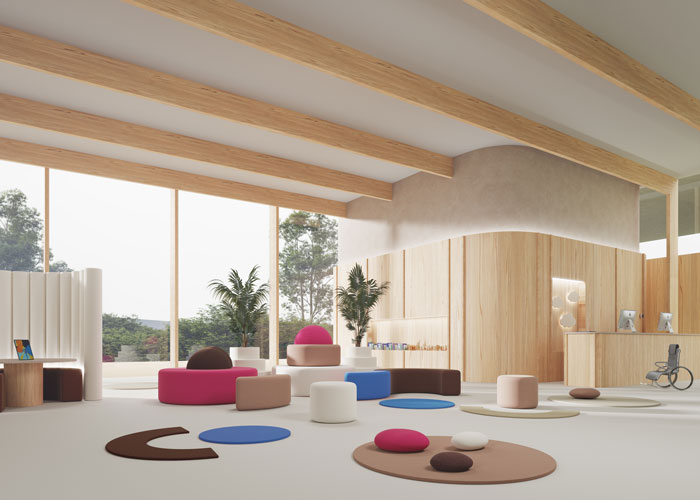 All the Awakening colours are used in this clean, modern waiting room of a healthcare facility against a backdrop of natural light and light wood. Research shows the health-boosting benefits of building in wood and what better place to incorporate this? Architects and designers are also no longer sticking to one colour – pistachio green in so many cases – for the interiors of these spaces. Here, modular seating is covered in several hues of the Awakening Palette: calming blue, pops of Viva Magenta, with touches of the more neutral taupes and brown thrown in for good measure. The discreet booth has a wall covered in white fabric and acts as a sound barrier for more private moments and discussions.