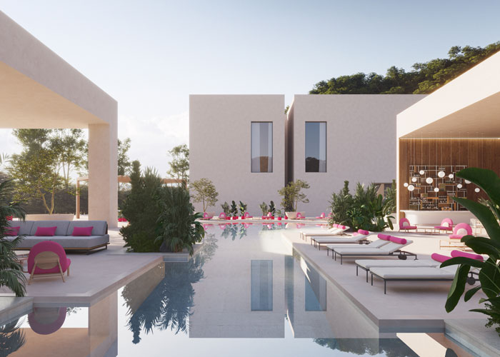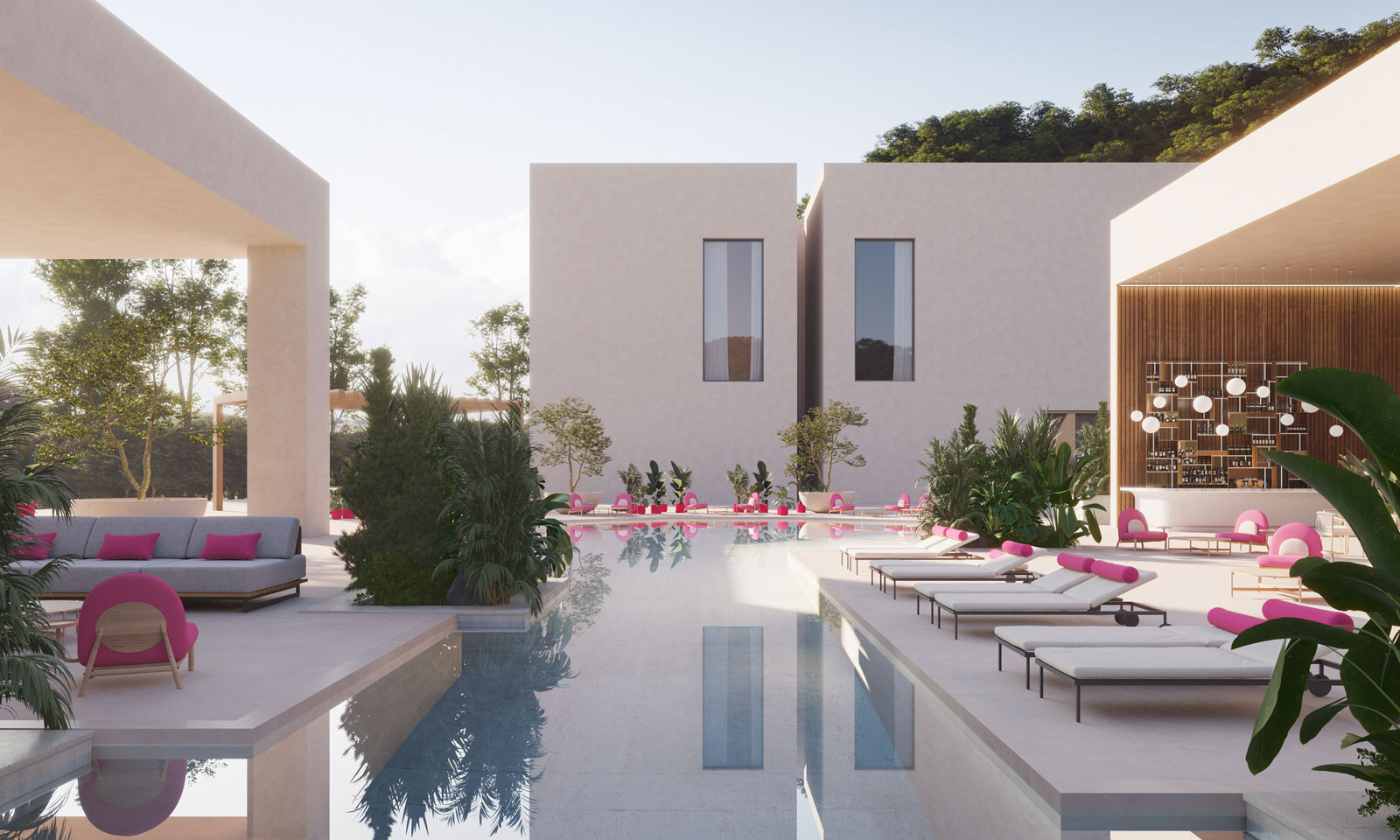 Any outdoor space, whether residential or hospitality, deserves colour. Here, Olly Mason has created an elegant outdoor space imagined in a modern hotel in tropical climes. The pool is the centre of the outdoor area, with the seating and lounge chairs covered in Coast outdoor fabric but brought to life with splashes of Viva Magenta. The Ultrafabrics outdoor collections, often used in boats and yachts for their water resistance and ability to withstand salt water, will not be affected by the pool chlorine. The corner bar animates the space and the foliage both provides warmth and shade dotted around the pool.