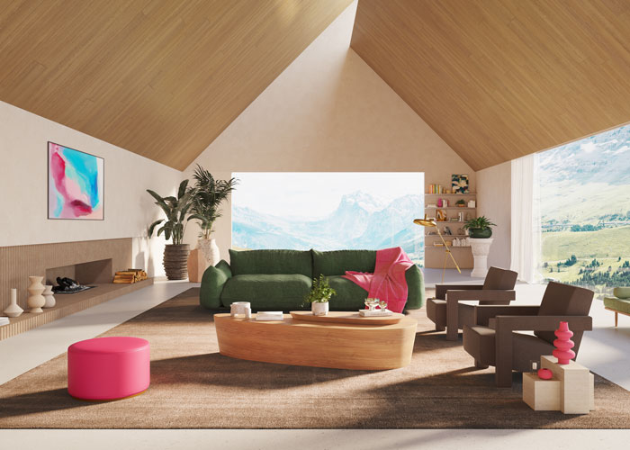 Modern, fresh and liveable, this residential or commercial interior has everything: comfort, style, warmth and colour. The oak-coloured ceiling dramatically frames the huge windows that look out onto mountain views, and the brown neutrals bring a sense of earthiness – from the woven rug to the Promessa in Horsehair fabric on the chairs. The green sofa is a nod to the surrounding nature while Vivid Punch brings just the right amount of liveliness to the space without seeming out of place.