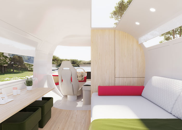 The recreational vehicle market is given a real treat with this imagining of the future of travel. jformento and Olly Mason have created a light-filled, glass-topped vehicle that is spacious, chic and fun, and truly brings the wonderful outdoors in. Living and camping in a moving house has never been more appealing. The light wood elements complement the cosy sofa bed, with Ultraleather Sonora covering the seating by the table and reflecting the colour of the trees and grass outside. Vivid Punch is used in small but powerful doses to liven up the neutral shades.