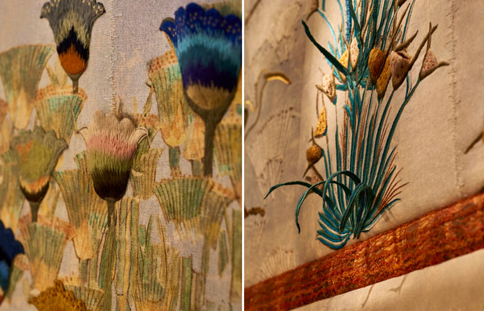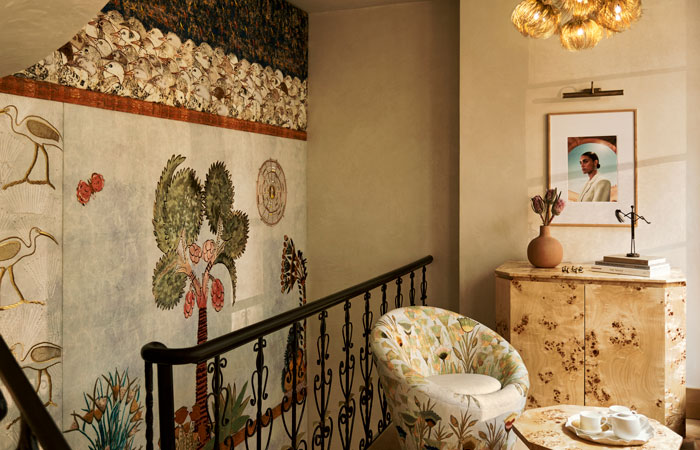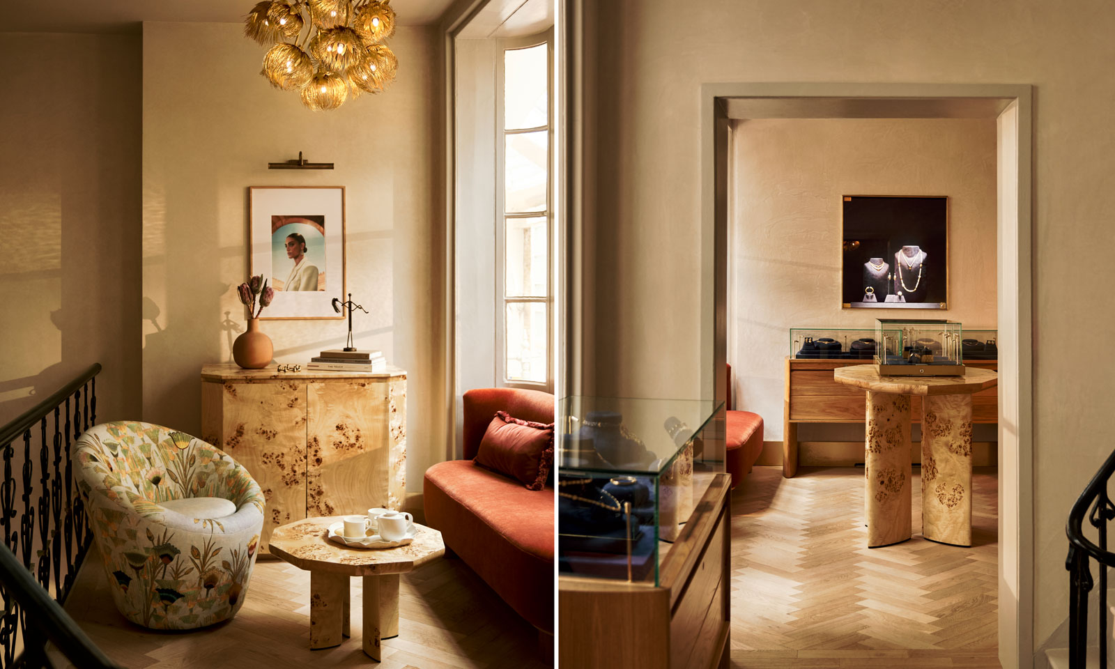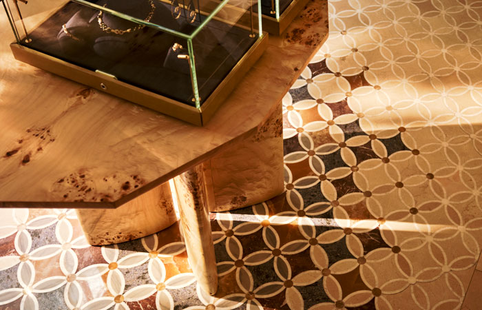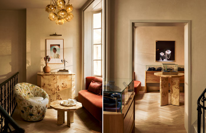 Bokja’s hand woven panelled tapestry leads customers to the first floor to the sejour that showcases the high jewellery collection. Bespoke window seats, artwork and wooden parquet flooring with a Kahhal looms rug invite customers to explore the pieces in the atelier.