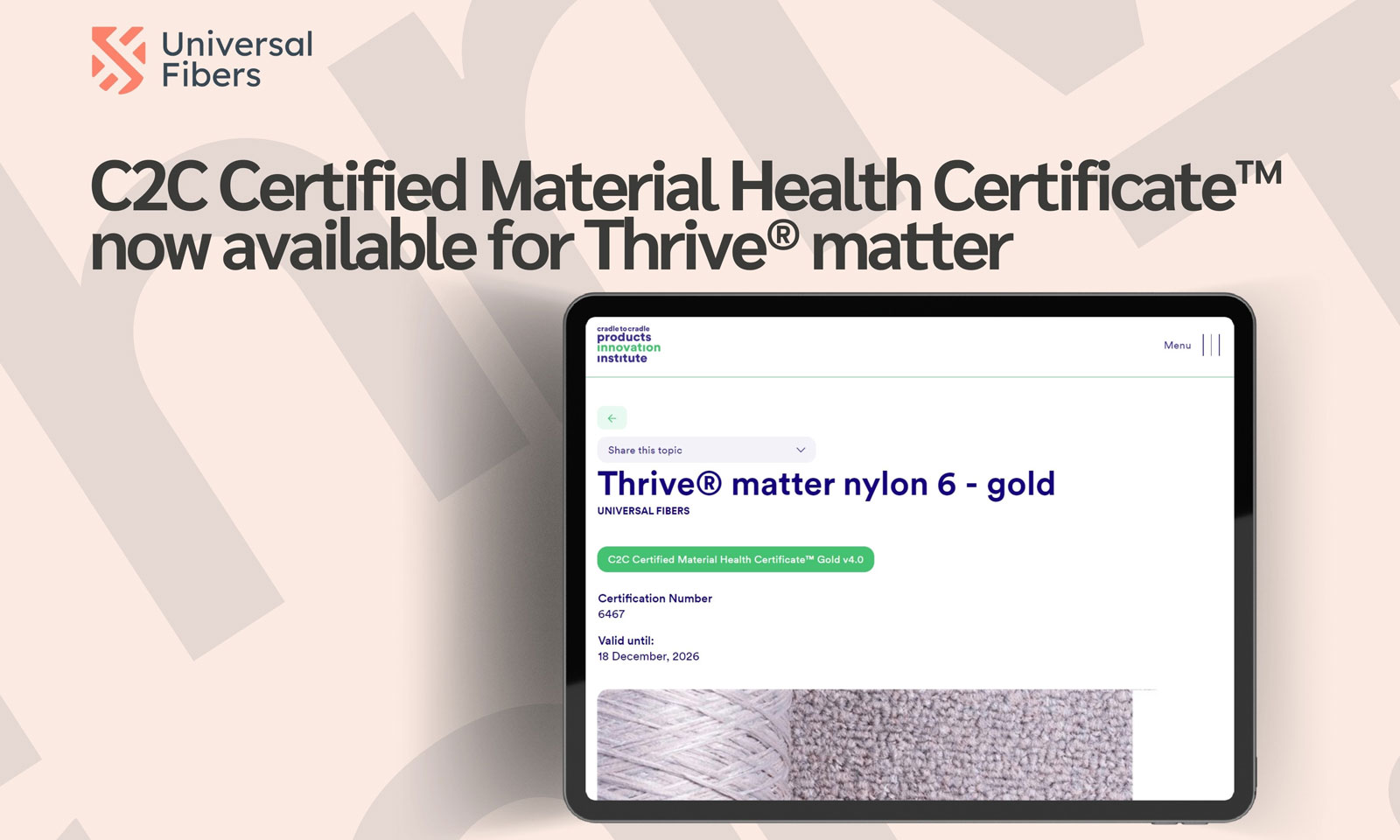 Anna Plumb, VP of Universal Fibers Sales and Marketing for Europe celebrates “Now our customers who select Thrive® matter nylon 6 can proceed with assurance that their products can in turn pursue C2C Certified certification. And they can be proud to have made the best environmental impact possible in their choice of fiber.”