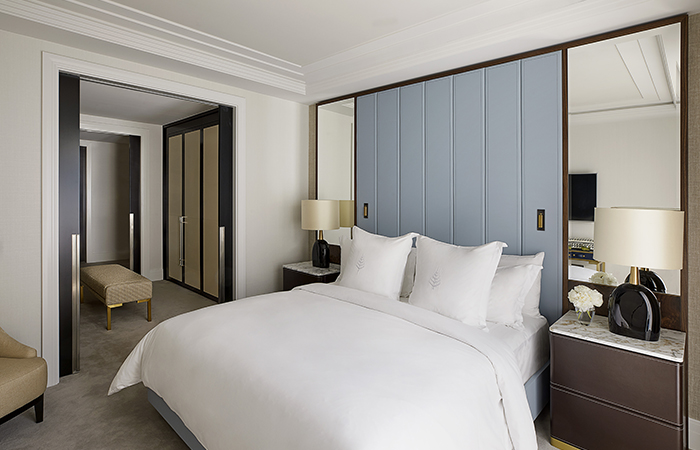 Situated on the fifth floor and available for short to longer-term stays, the residences showcase premium living coupled with five-star hotel amenities. Featuring brass finishes and finer details of silk and leather, the interiors pay homage to the neo-classical architecture of the building. Timber panelling, contemporary marble fireplaces and the use of decorative metalwork screens define the use of space within these large open plan apartments.