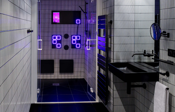 At its heart is an intuitive control unit that orchestrates water, light and sound into customisable scenarios. Integrated LED panels, ambient lighting, a horizontal wall module with hidden storage and advanced shower elements create a seamless composition that adapts to the user’s mood – from energising to meditative.