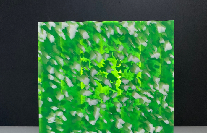 Reducing carbon through manufacturing is also a key objective of the Chinese material manufacturer, DECO DECO. Their glass resin panels use surplus material as a base, transforming scrap material that would otherwise go to waste, while allowing for ongoing recycling. Like Elenite, their surfaces are formaldehyde-free, and come wth a European Standard certification. What’s more, their unique translucency allows for an interplay with light, with speckles of opaque colour creating dappled effects, while natural elements such as leaves and petals suspended in transparent glass allow for particle privacy.