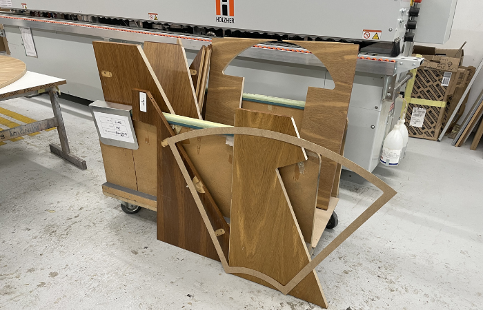 The same can be said for those buying furniture from Opus Magnum’s ReCrafting initiative, such as Legal & General, which supplied ten boardroom tables, originally made in 2007, for repurposing. From them, the team redesigned a new circular table, with hinged material matched flaps in the centre and a round pedestal base. The original tops were cut into a new shape by CNC according to their grain pattern, and then artfully joined together.