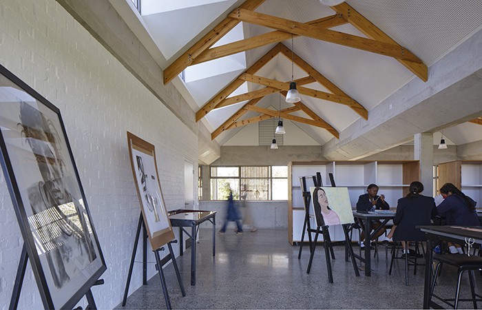 The ESTEAM Centre sits prominently near the entrance, highlighting the school’s pioneering approach to learning and creating new links across the site. Native vines trail up the tension cables on the terrace to ground it in nature and provide shading, while the white walls and dark gable roofs are a contemporary response to the Cape Dutch aesthetic. Its robust materiality and pared-back design respond well to the climate and create an honest building; one that will be used creatively and boldly.