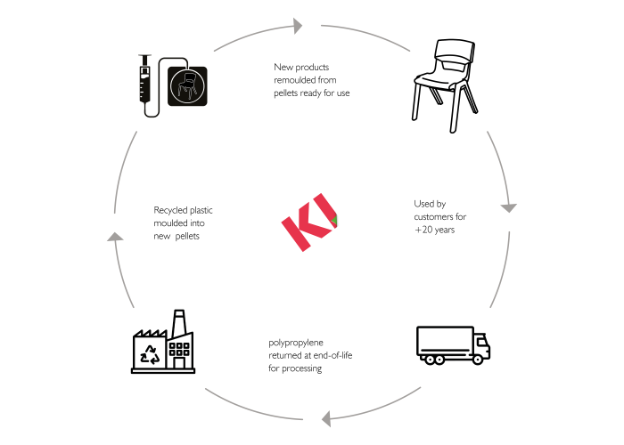 Collection and reverse logistics will form part of this plastics loop. KI is working with recycling partners that provide facilities that can transform plastic chairs into plastic pellets, which will in turn be the feedstock for newly manufactured products. This is particularly straightforward with the Postura+ one-piece chair as it is 100% polypropylene and does not require any disassembly.