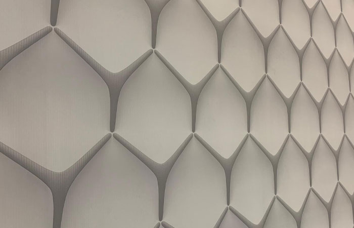 The design was manipulated and manufactured by the exceptional UK Muraspec team to make the motif pop out and enhance the 3D effect on the wall. The shadows were reworked and a gloss white layer created and printed under the structure of the motif. The subtle difference in reflectivity compared to the background provided further depth to the design once installed. Being a vertically integrated manufacturer, Muraspec were able to ensure that each step of the design and production process met the highest standards set by the client.