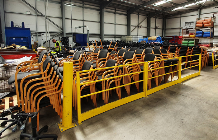 Furniture is broken down into its constituent parts so for instance the polypropylene chair backs are broken down into pellets, with some going into garden furniture. Wood and MFC boards can be shredded for biomass fuel, animal bedding and some is sent back to local MFC Board manufacturers for reuse.