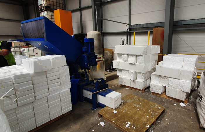 Polystyrene edging foam is one of the hardest materials to recycle but the approach here is to ‘re-use’ and edging material that is in good enough condition is marked with a dot each time it is sent out and the internal record for this currently stands at 7 uses. Eventually the foam has to be recycled and this starts with a mechanical process to compress it to remove the air and this results in a lorry load of polystyrene being compressed down to a very dense one cubic metre block. Each year Sustain recycles the equivalent of 50 articulated trucks of polystyrene much of it going to be use in insulation, and to make products such as park benches, decking, bannisters.