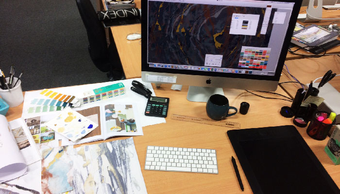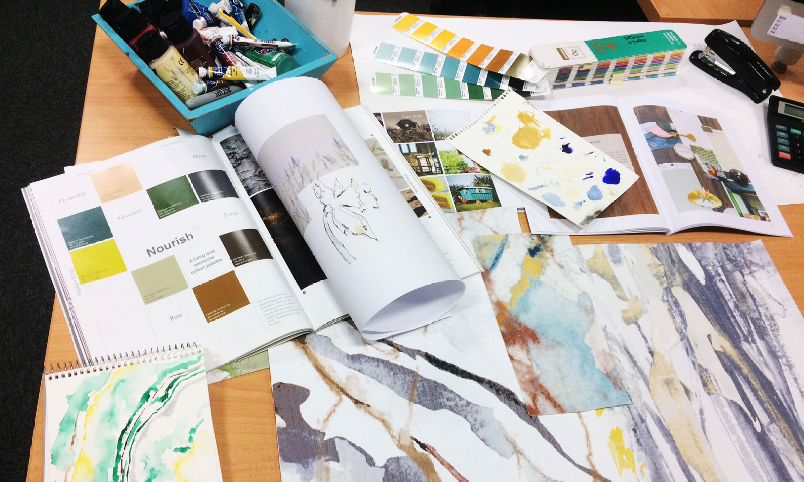 ‘I have present on my desk the Nomad, Agate designs with follow on development ideas for future collections, we love exploring colour combinations so tend to start ideas based on colour then we look at the pattern trends influencing the interior world and start drawing up designs from the research we’ve gathered. It’s important we create a mood around us with imagery to help inspire.’