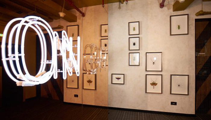 Global interior architecture firm Wilson Associates designed the 6,000 square foot space include neon ‘On/Off’ sign at the entrance, a crystal chandelier composed of skulls and bones, gold-painted ceilings, and an over-scaled sofa, all of which perfectly reflect the business’s character and innovative approach to design.