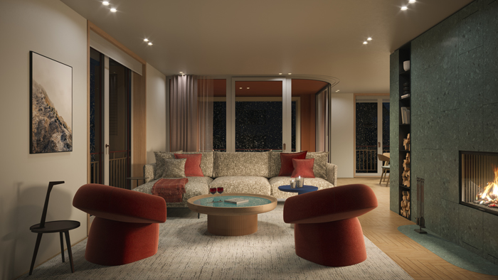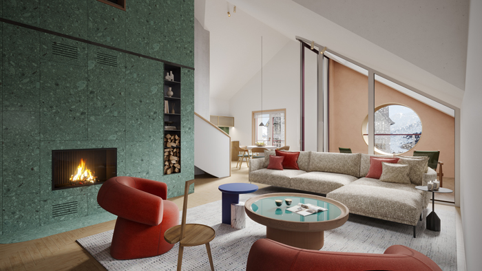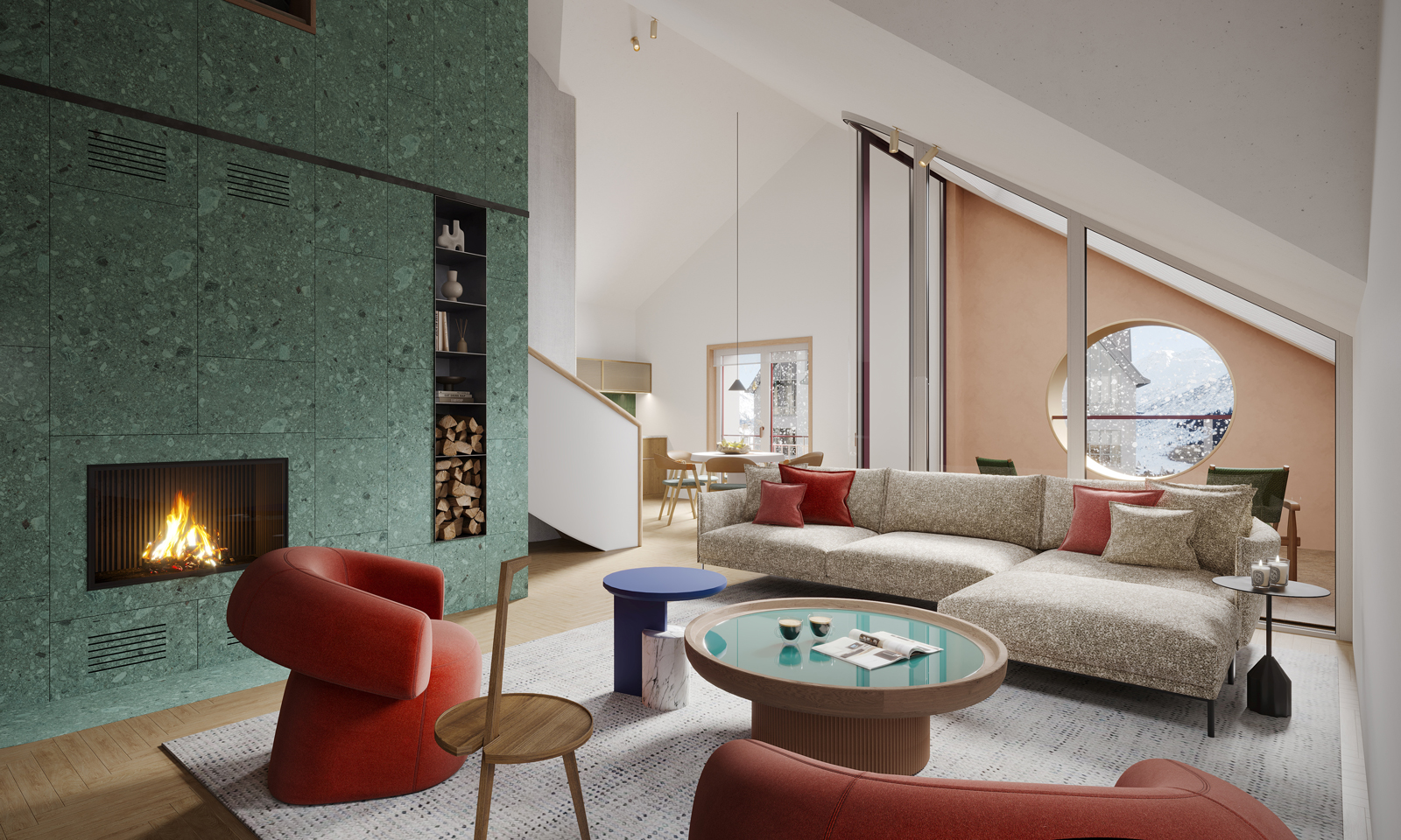 14 residences and 3 penthouses are being built in house Maya. Each apartment is between 105m2 and 138m2 in size. The fireplace in the living room is embedded in a wall of green Salvan stone. The oak cupboards and herringbone parquet floors provide a natural warmth. Urquiola gave them her characterful signature style, from splashes of colour to bespoke and curated furniture.