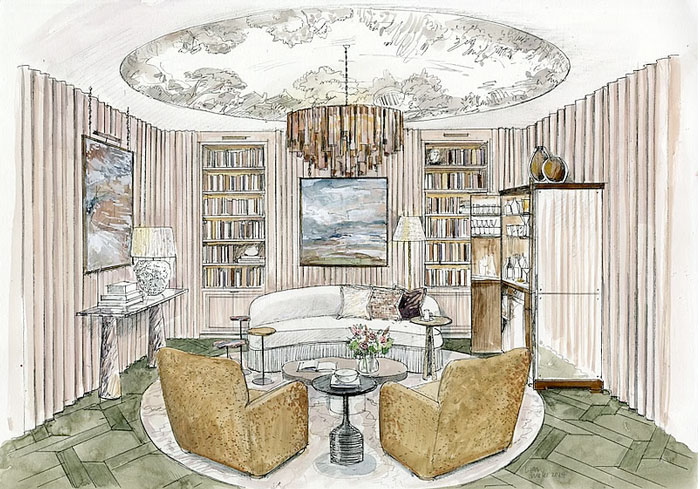 Yes, working with Chase Erwin was particularly special because our visions are so aligned, and the concept just naturally evolved. They were assigned the library room, which can be a bit of a challenge because, typically, a library is filled with lots of joinery and books. However, we embraced this and built our concept around my background in ballet, integrating it into the design of the room. I trained in ballet since I was eight in Italy but won the scholarship when I was 17 and moved to London then to attend The English National Ballet School.